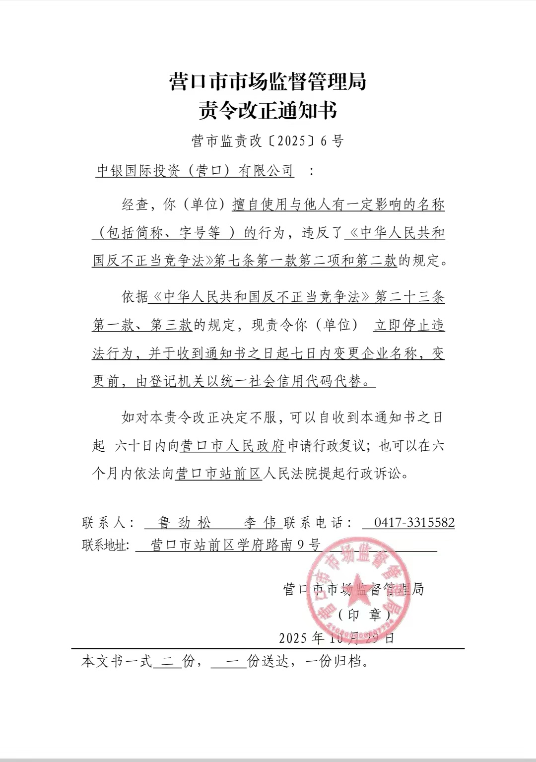 关于中银国际投资(营口)有限公司责令改正通知书的送达公告